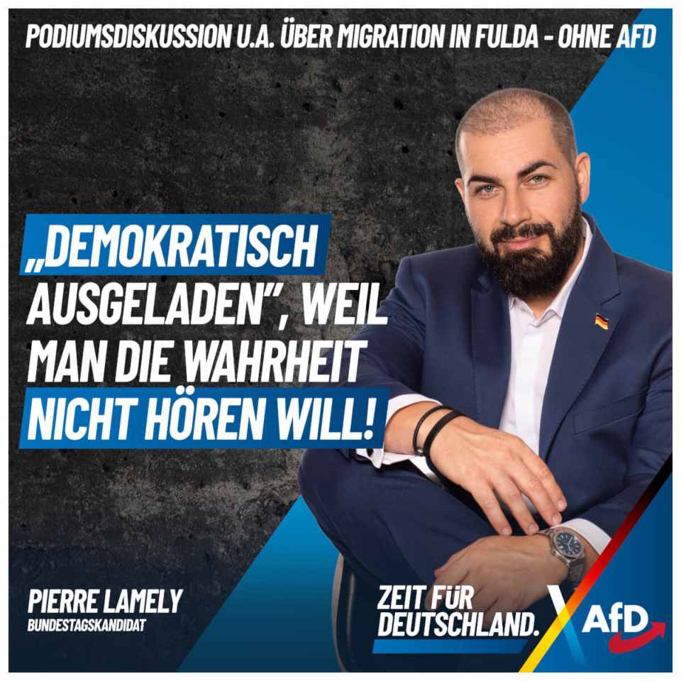 In Fulda wurde eine Podiumsdiskussion zur Bundestagswahl über Migration, Integration und Menschenrechte abgehalten – ohne die AfD! Begründung des Projektleiters Jochen Kohlert gegenüber der Presse: „Es war eine demokratische Entscheidung unserer Teamsitzung, die AfD nicht einzuladen. Sie präsentiert bei den Themen keine passenden Lösungen…“