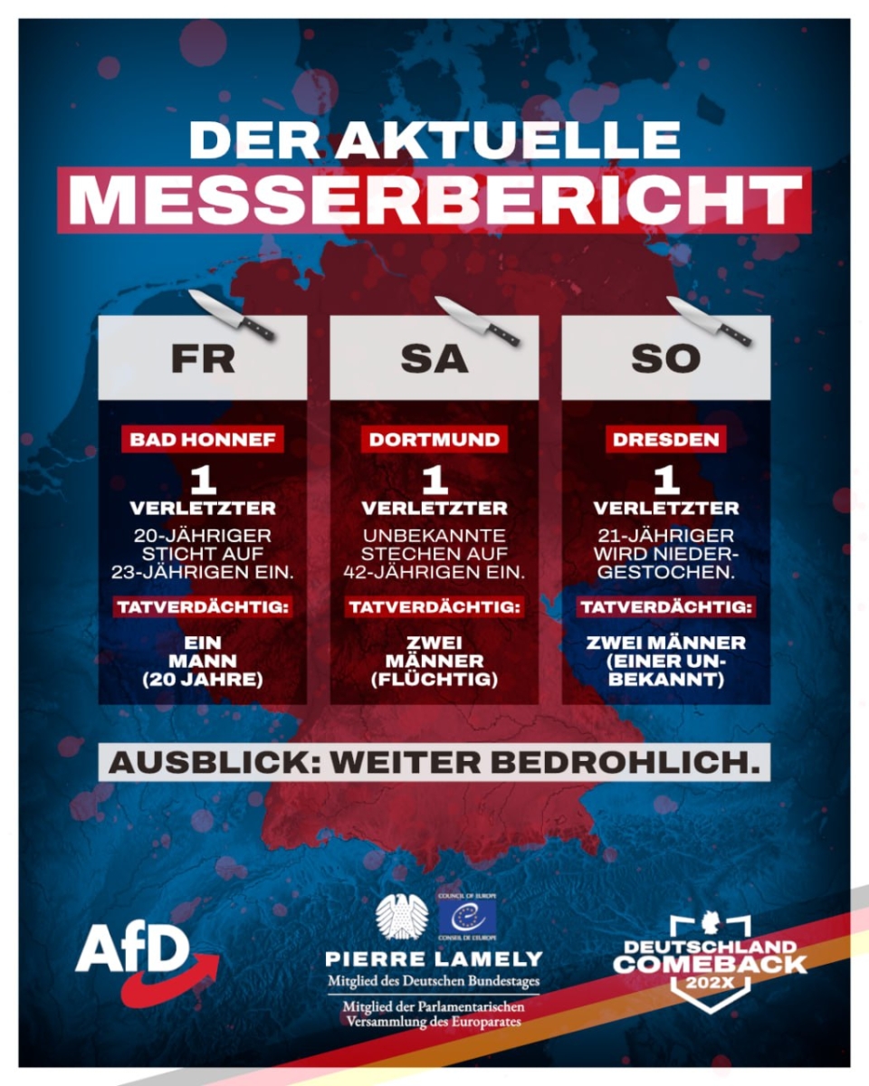 📍 Dresden: 21-Jähriger (US-Bürger) schritt ein, als zwei Frauen von Migranten in einer S-Bahn belästigt wurden. Einer der Täter griff ihn mit einem Messer an und verletzte ihn schwer. Er kam ins Krankenhaus, ein festgenommener Syrer kam nach 12 Stunden wieder auf freien Fuß.