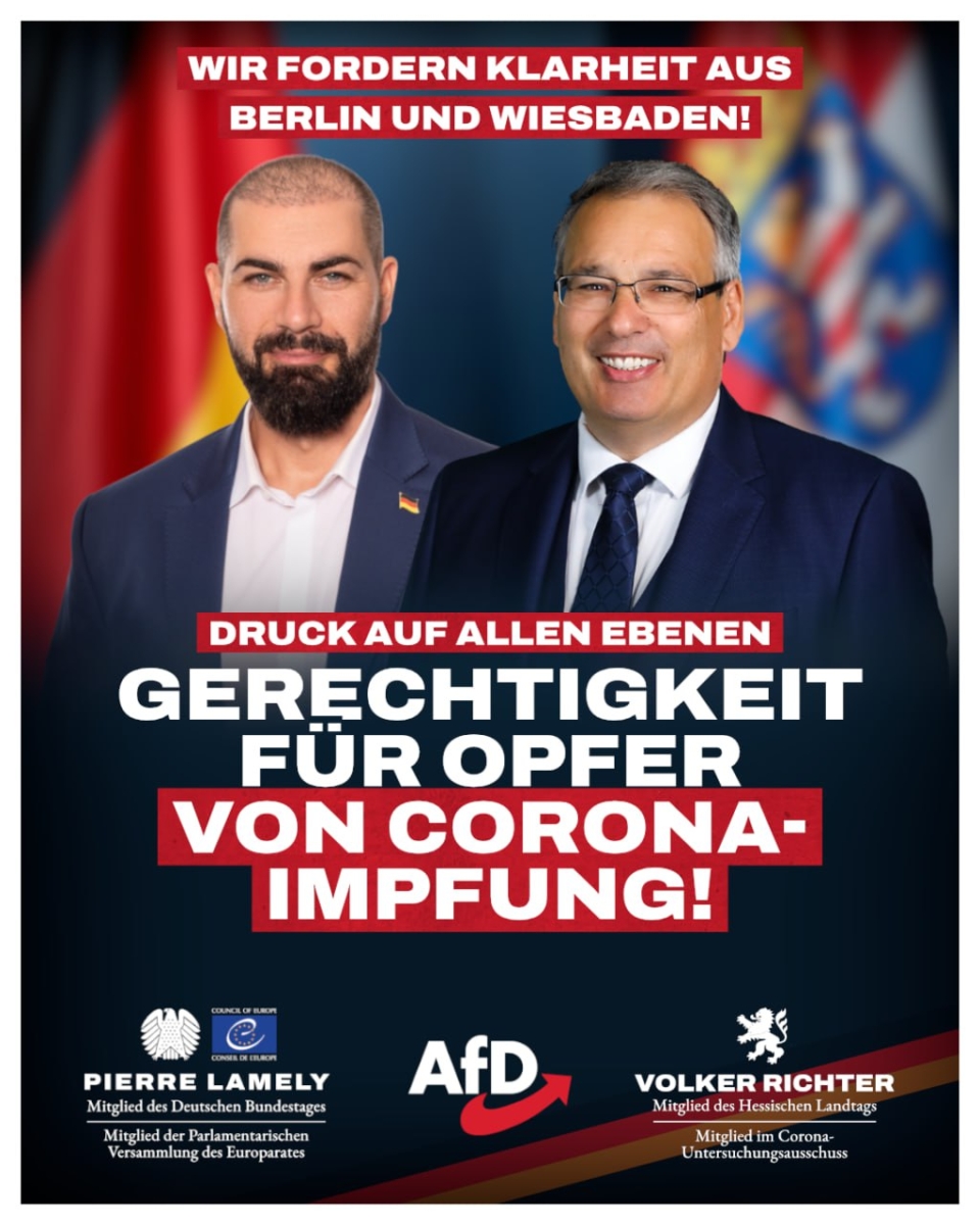 „Da aus Berlin keine klare Antwort kommt, muss nun auf Landesebene nachgehakt werden. Deshalb hat unsere AfD-Fraktion im Hessischen Landtag eine Große Anfrage an die Landesregierung gestellt. Wir wollen auf Landesebene endlich jene Klarheit schaffen, die der Bund verweigert und erfahren, wie das Land mit dieser Haftungsfrage umgehen will“, führt der Landtagsabgeordnete Volker Richter, gesundheitspolitischer Sprecher der AfD-Fraktion und Mitglied im Corona-Untersuchungsausschuss des Hessischen Landtags, aus.