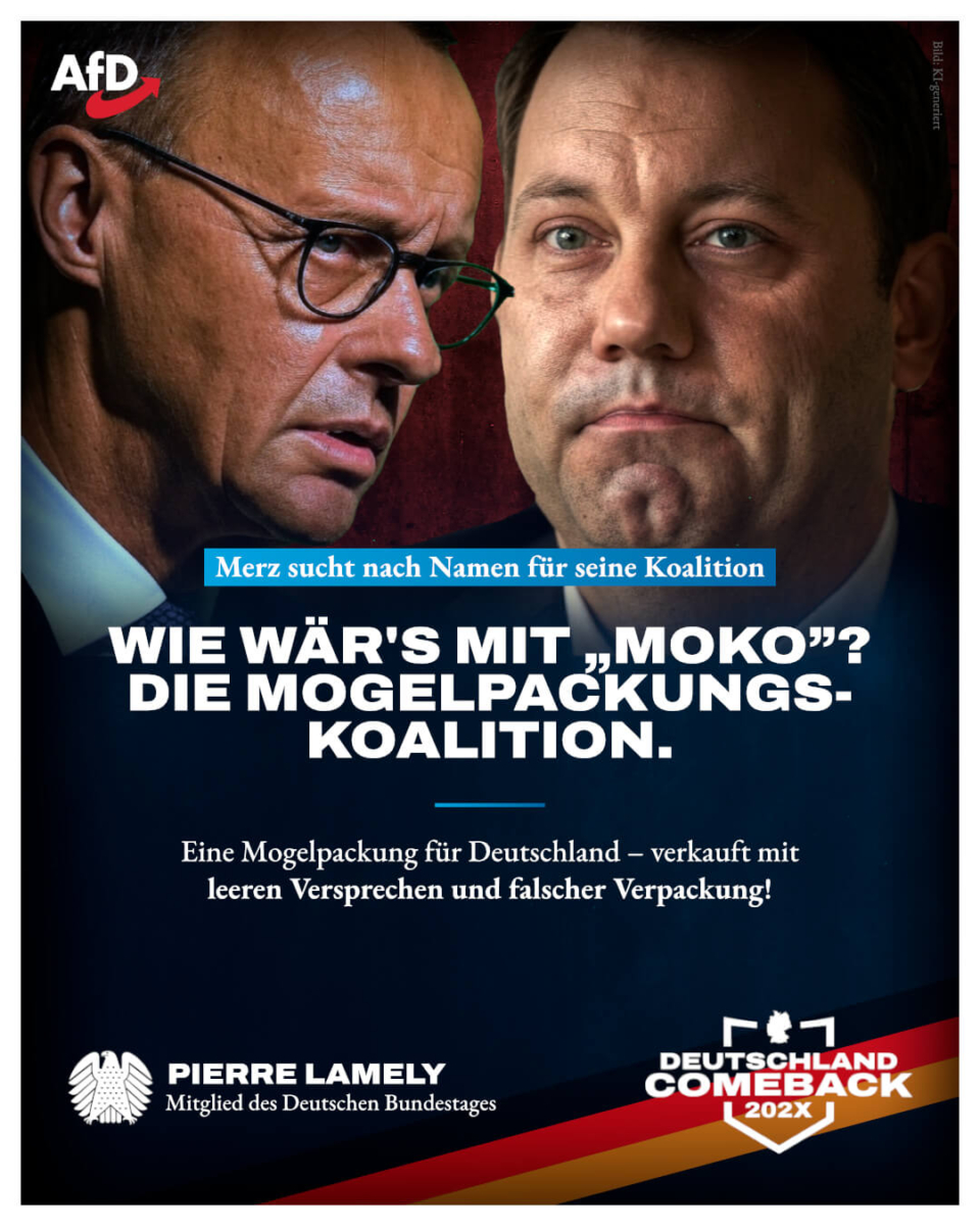 Friedrich Merz sucht hĂ€nderingend nach einem neuen Namen fĂŒr seine geplante CDU-SPD-Regierung, weil ihm „GroKo“ nicht mehr gefĂ€llt. Ich hĂ€tte da einen Vorschlag: “MoKo” – die Mogelpackungs-Koalition!