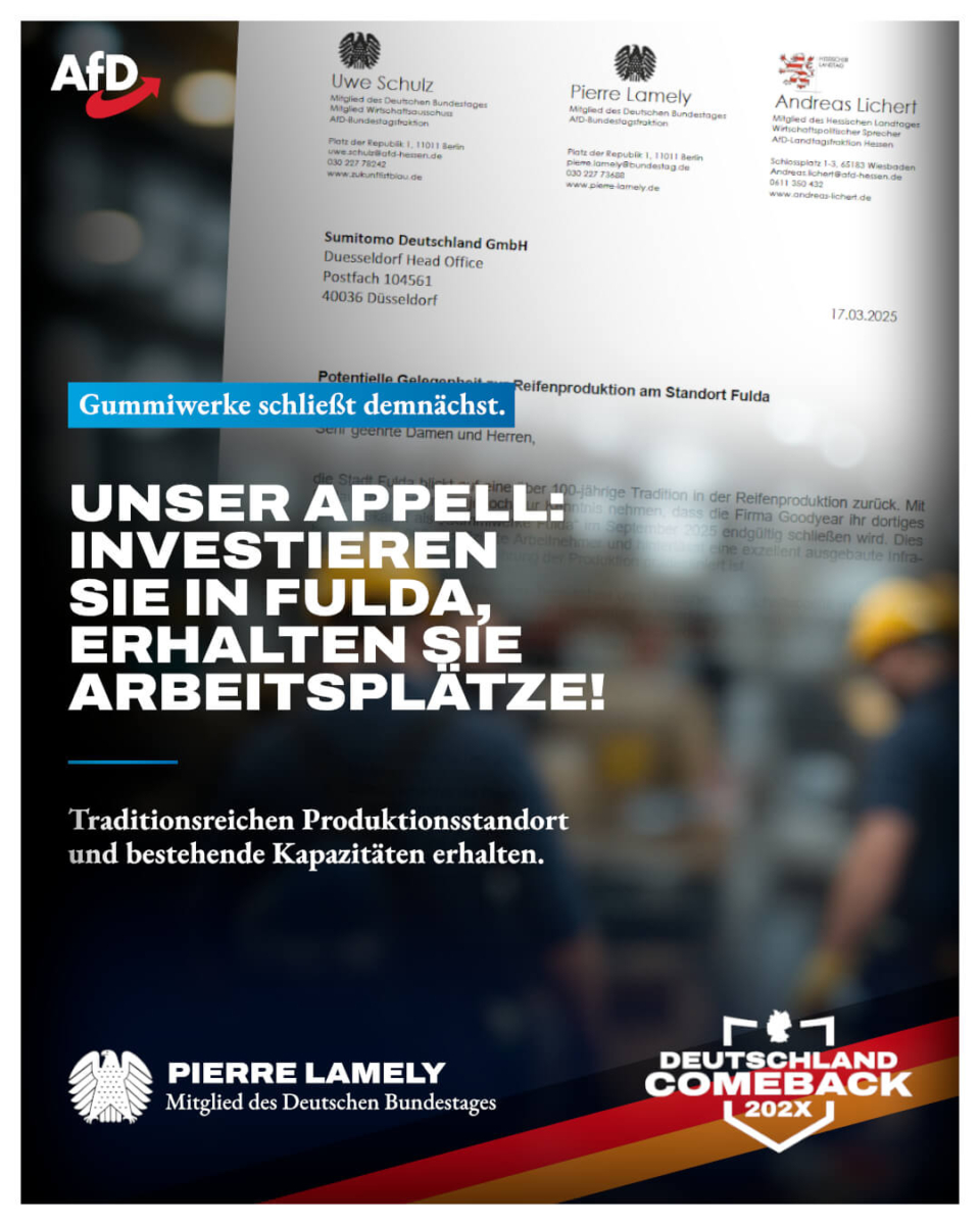 Andreas Lichert (MdL), Uwe Schulz (MdB) und ich haben Investoren auf den traditionsreichen Produktionsstandort in Fulda aufmerksam gemacht. Mit einem Brief haben wir Sumitomo Rubber Industries, einen weltweit erfolgreichen Reifenhersteller, eingeladen, die bestehenden Kapazitäten zu nutzen und in Fulda zu investieren. Warum? Weil Fulda perfekte Voraussetzungen für eine erfolgreiche Produktion bietet: